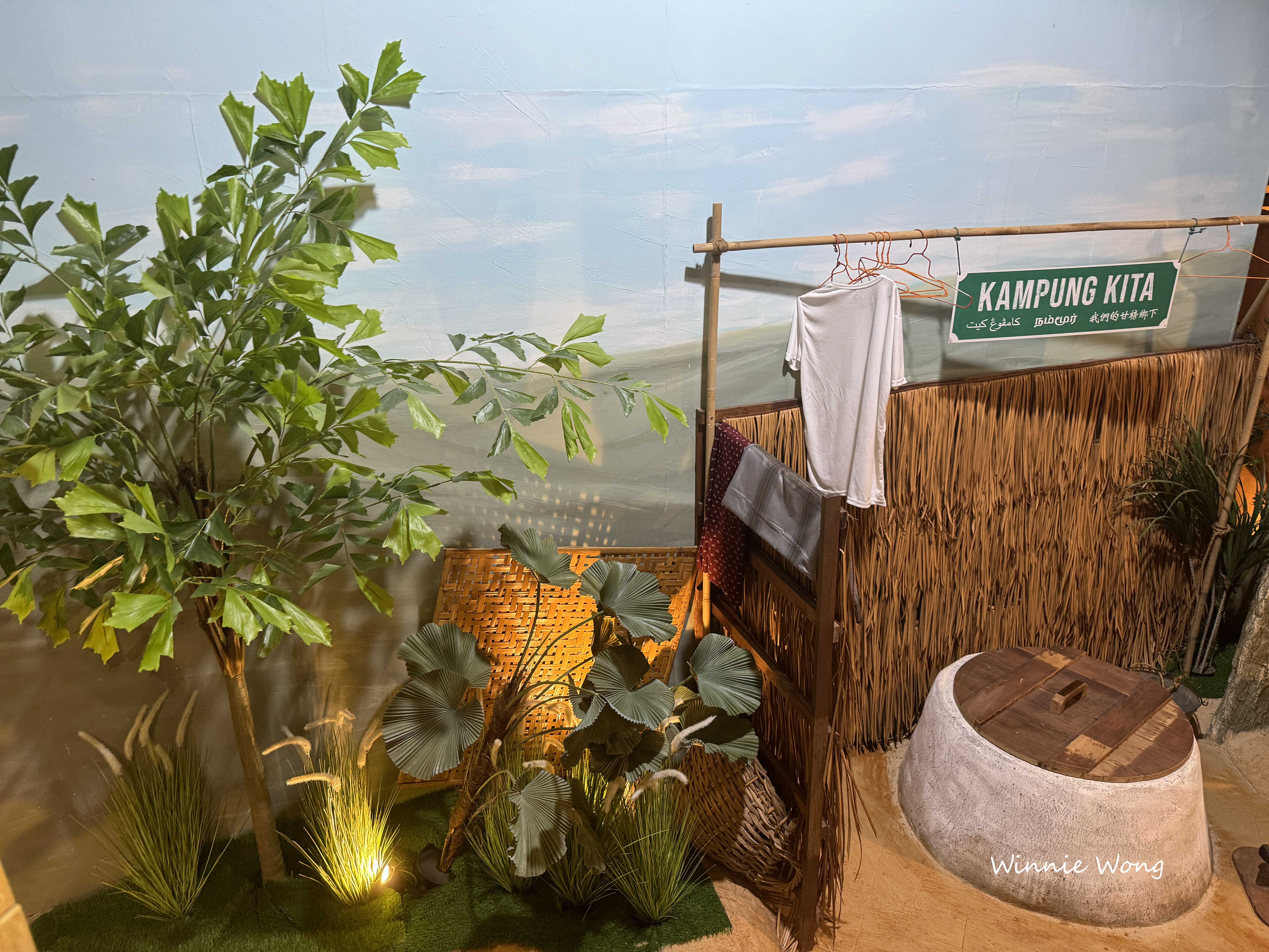 A Malay kampung house is recreated, featuring a living area with rattan chairs and everyday kitchen items, showcasing the essentials of minimal living.