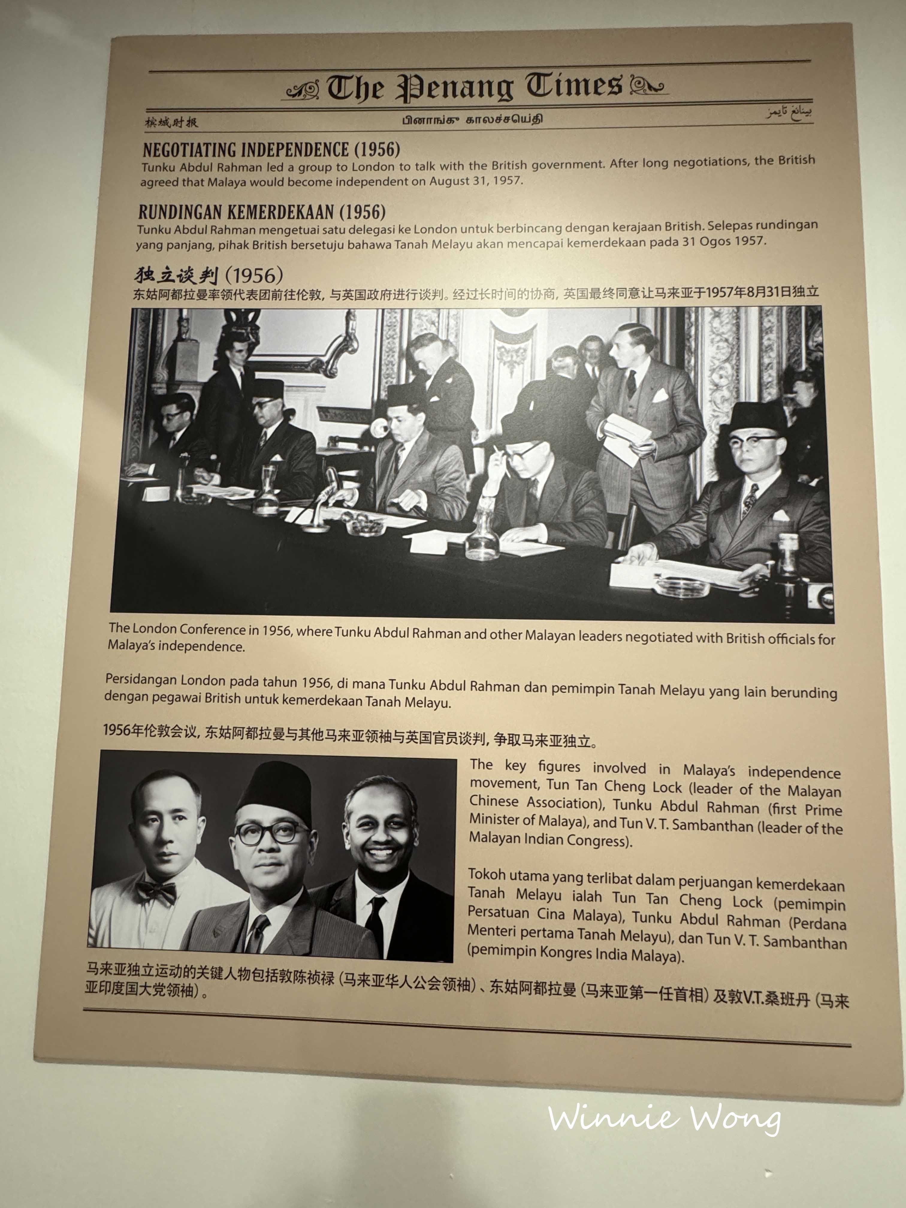 As you leave the social history area, the atmosphere shifts from tension to hope. The path leads you toward panels that tell the story of Malaya’s independence and the formation of Malaysia, giving a clearer picture of Penang’s place within a new nation. Informative boards explain how the country changed after gaining freedom, and what those changes meant for the people who lived on the island.